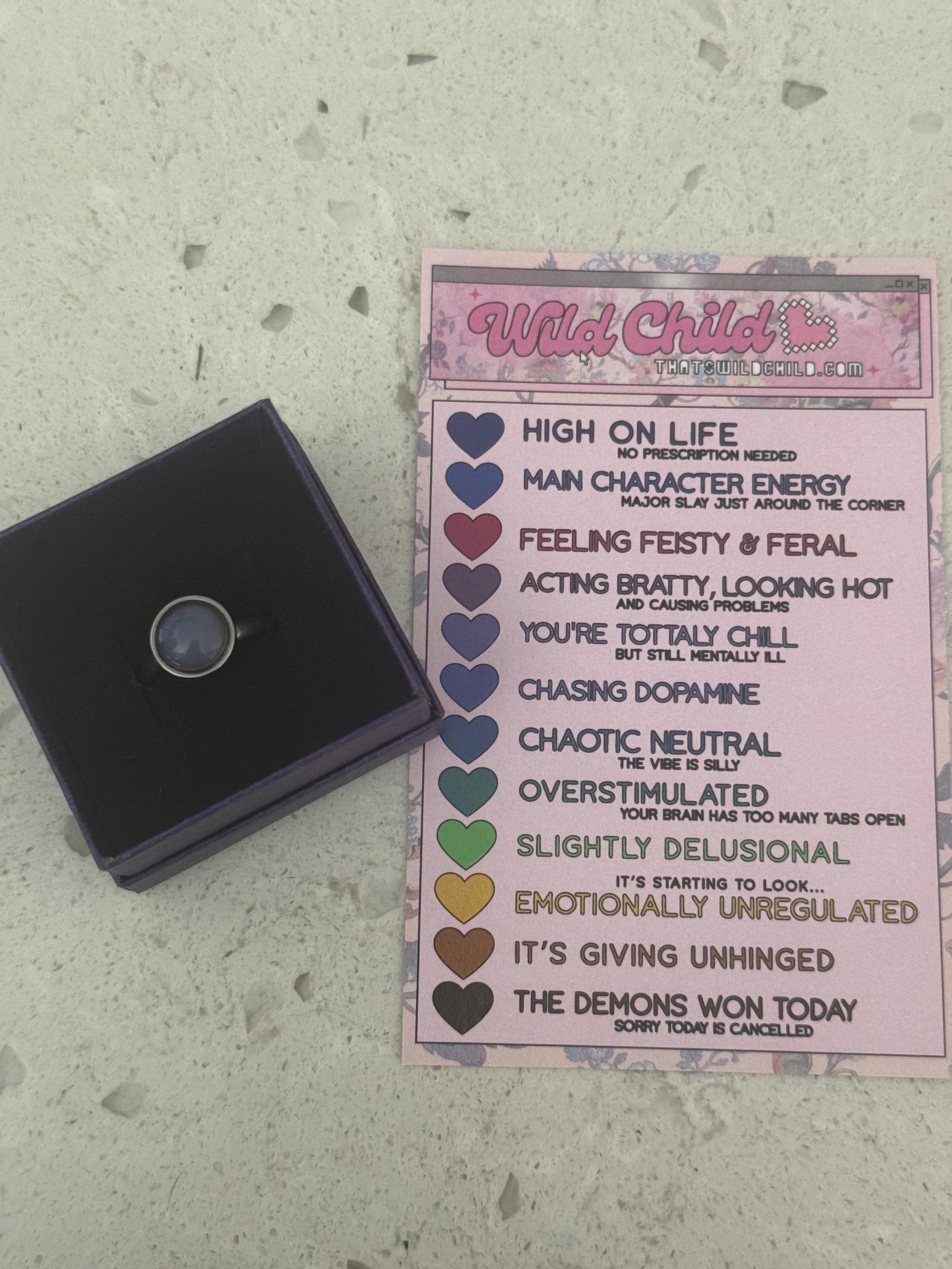 Each ring includes a Wild Child custom mood chart printed on premium paper, featuring highly scientific emotional states like: