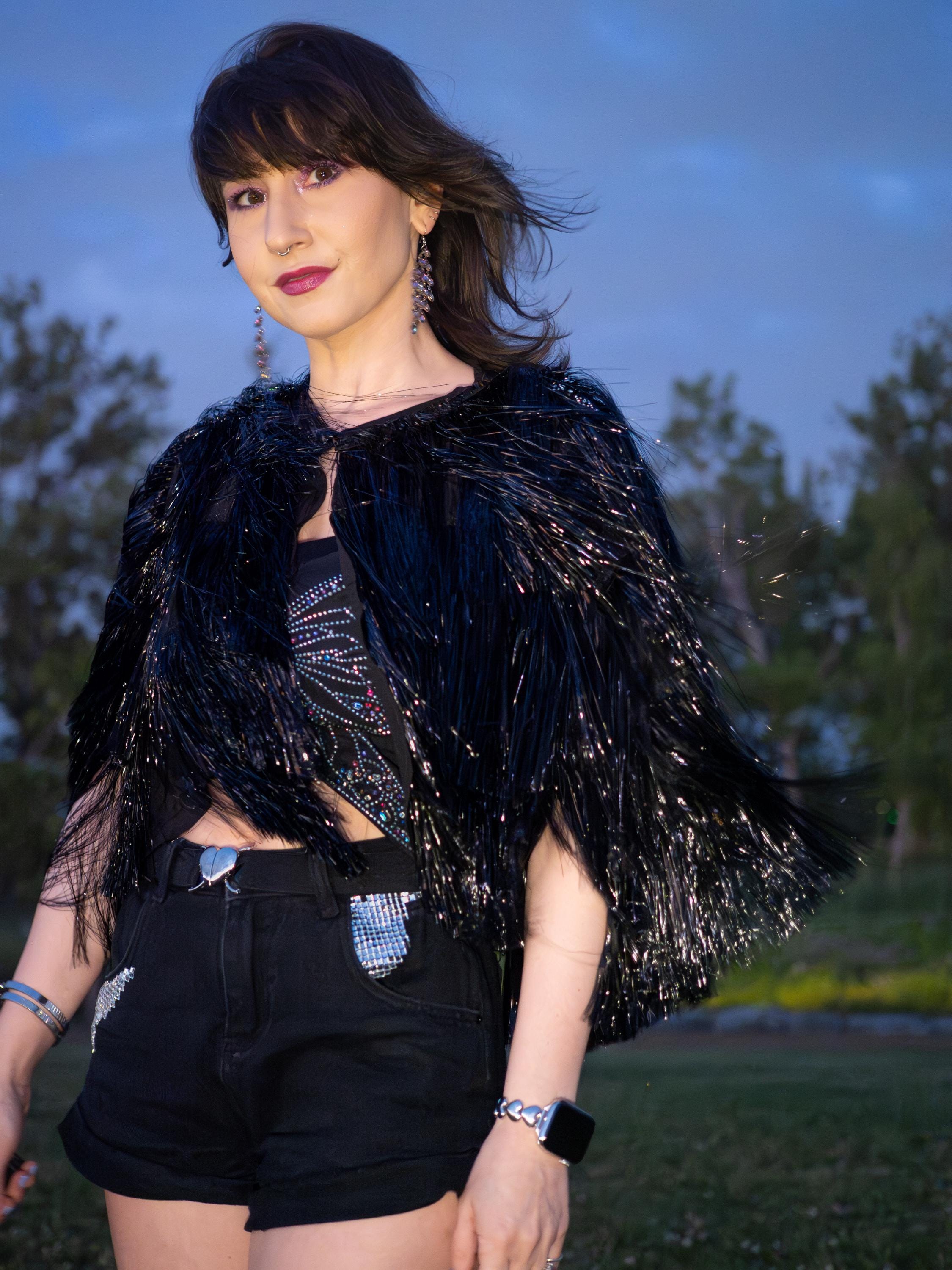 Handmade with love and care, each strand of black tinsel is reinforced for longevity and nonstop wearability (using our own unique process tested to be the most durable tinsel jacket you can find!) . Each shoulder adorned with glamorous rhinestone trim, and neckline covered in luxurious silk ribbon, no detail too small. Lightweight chiffon lining keeps this jacket light and breathable, keeping you cool while looking hot, perfect for your next concert, rave, party, or festival adventure, it is built to actually last 🖤
