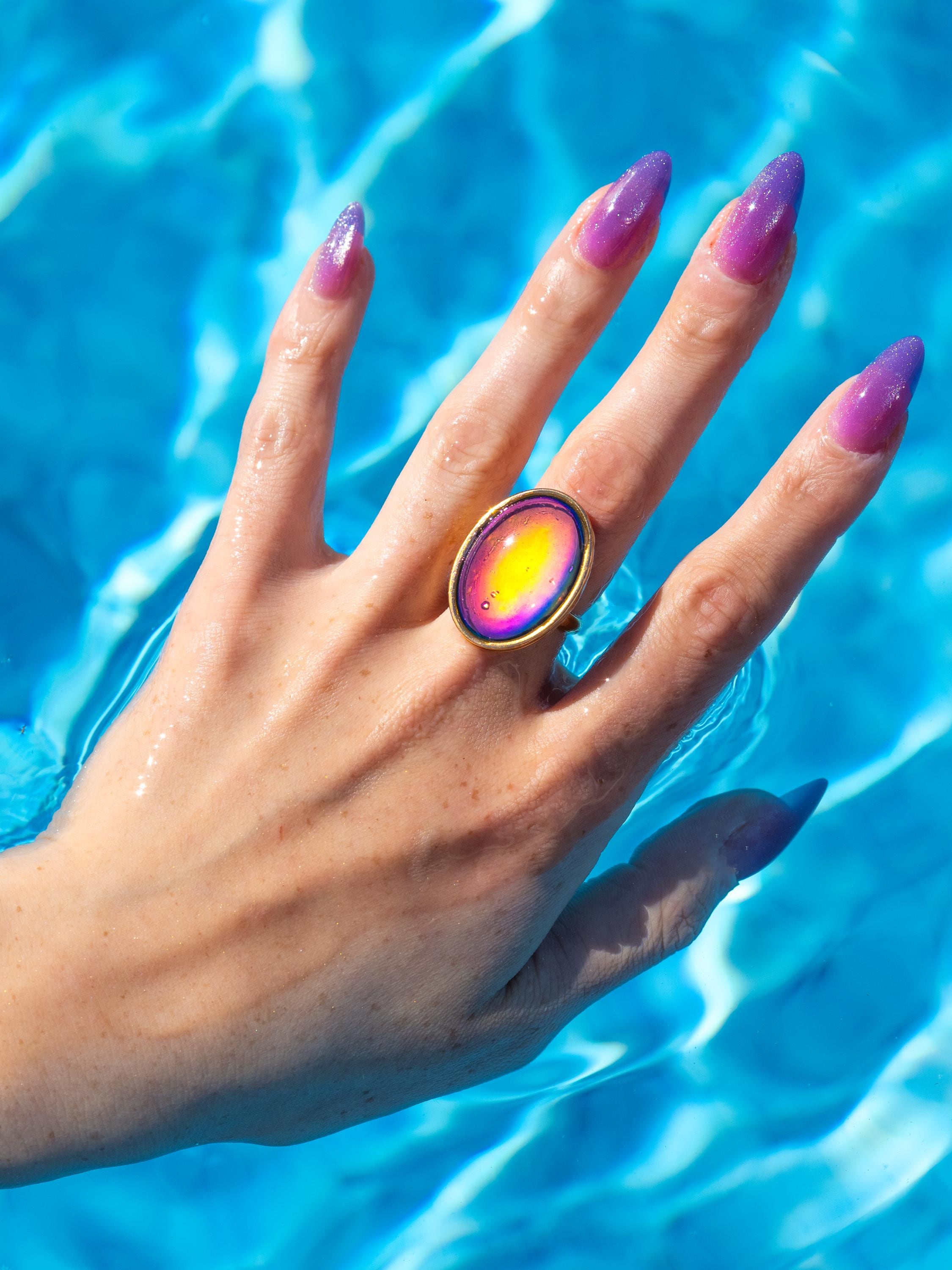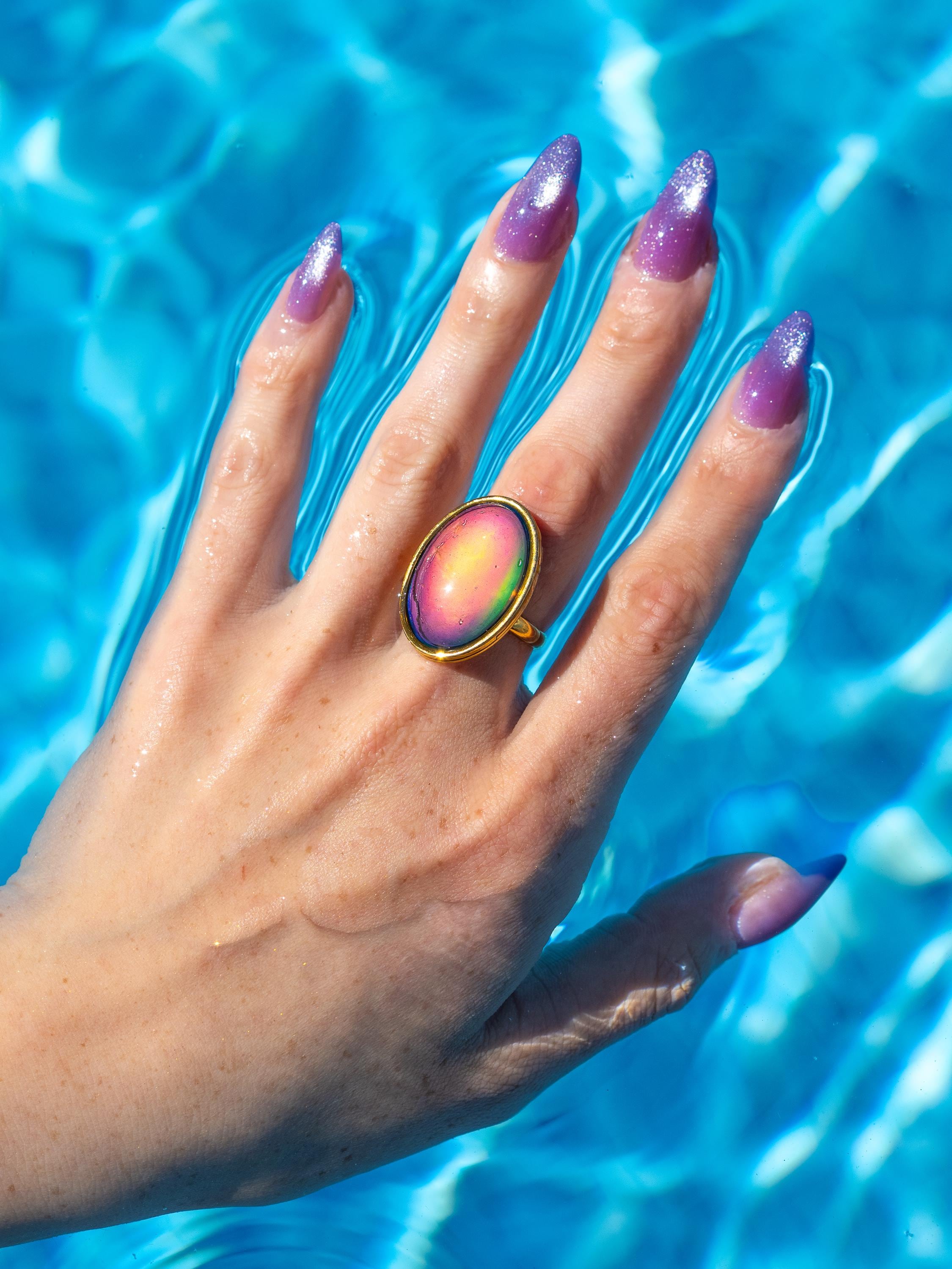 Traditional mood rings don’t love moisture. Water can permanently damage the color changing layer, which is why so many mood rings turn black or stop working after a few weeks. This ring was designed and tested so you don’t have to take it off to wash your hands.