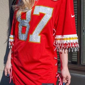 Please select all options before making your purchase, additional trims and embellishments can be substituted and/or added by request, please reach out for more options or to create a custom one of a kind football, hockey, basketball, any kind of jersey, in any color scheme, just for you! Rush options available by request. Please reach out if you are ordering for a different color jersey than pictured in the listing photos, to confirm availability of materials/ additional processing times.