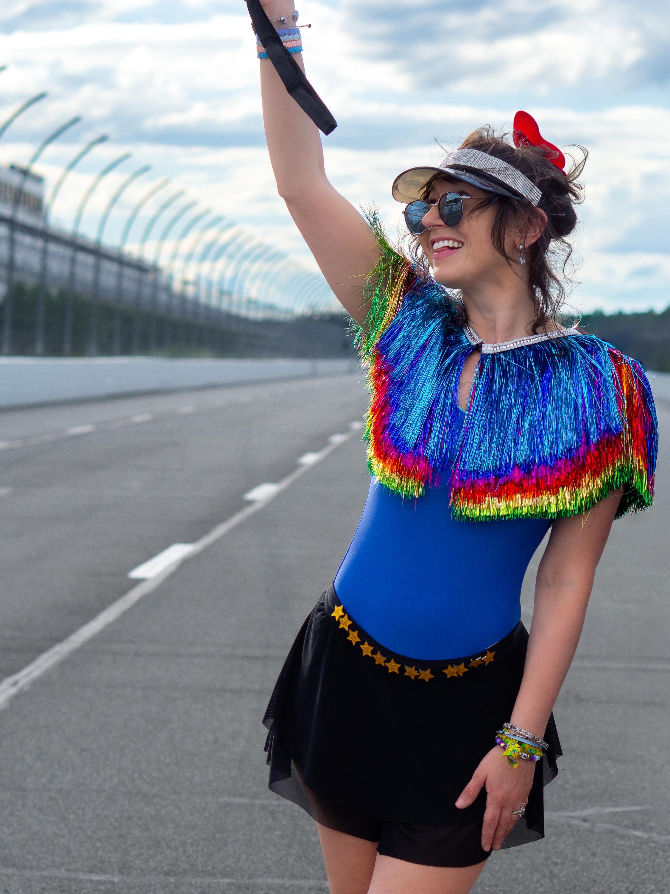 This one of a kind shoulder piece is made for anyone who loves color, drama, and a little extra chaos in the best possible way. Throw it over a bodysuit, dress, swimsuit, crop top, or stage outfit for an instant transformation. The rainbow fringe creates beautiful shimmer and movement while keeping the fit easy and comfortable.